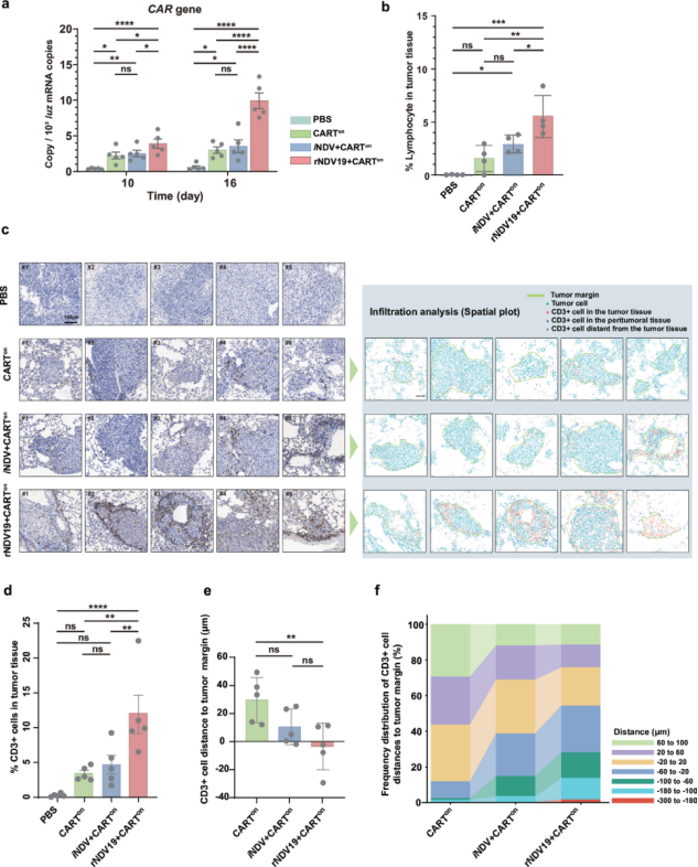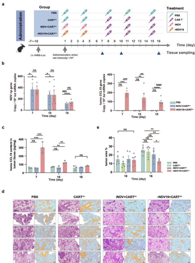 在验证此基础后,进一步的分析表明,与CAR-T细胞联合使用时,rNDV19治疗组在后期表现出显著的肿瘤面积缩小,其效果优于其他对照组,展现了强大的抗肿瘤疗效(图2d, e)。