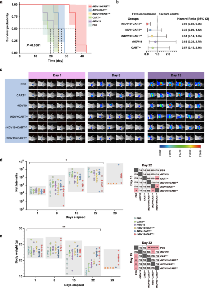 图4.rNDV19与CAR-T细胞的联合治疗显著延长了荷瘤小鼠的生存期