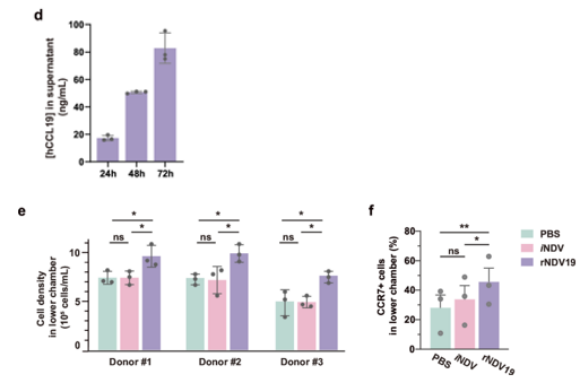 研究者将rNDV19经过工程化改造,将hCCL19基因插入HN和F基因之间,并通过测序验证(图1a)。为评估插入的基因是否影响病毒复制,同时比较了rNDV19感染或iNDV感染的细胞上清液中的病毒滴度。结果显示,rNDV19的复制能力与iNDV相当(图1b)。