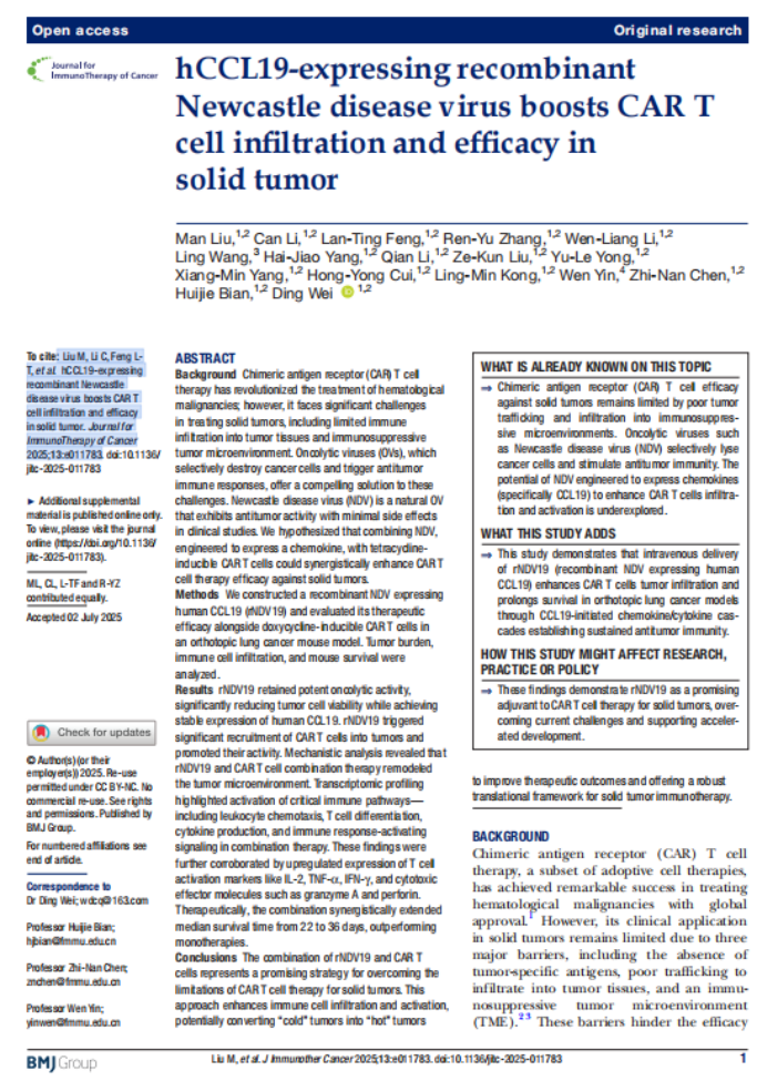 Liu M, Li C, Feng L T, et al. hCCL19-expressing recombinant Newcastle disease virus boosts CAR T cell infiltration and efficacy in solid tumor. Journal for ImmunoTherapy of Cancer. 2025;13:e011783