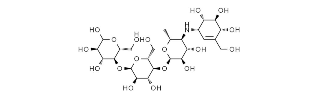 阿卡波糖(Acarbose)是一种复杂的低聚糖,以“葡萄糖-葡萄糖-葡萄糖”的三糖链为基础,在末端葡萄糖单元的C4位连接一个含氨基的环-己烯结构,形成独特的伪四糖结构。其来源大部分是人工合成的,是一种有效的α-葡萄糖苷酶抑制剂可用于调控血糖。
